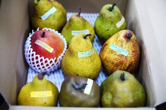 蔵王町円田の不忘果樹園では色とりどりのたくさんの種類の洋ナシを作っています。